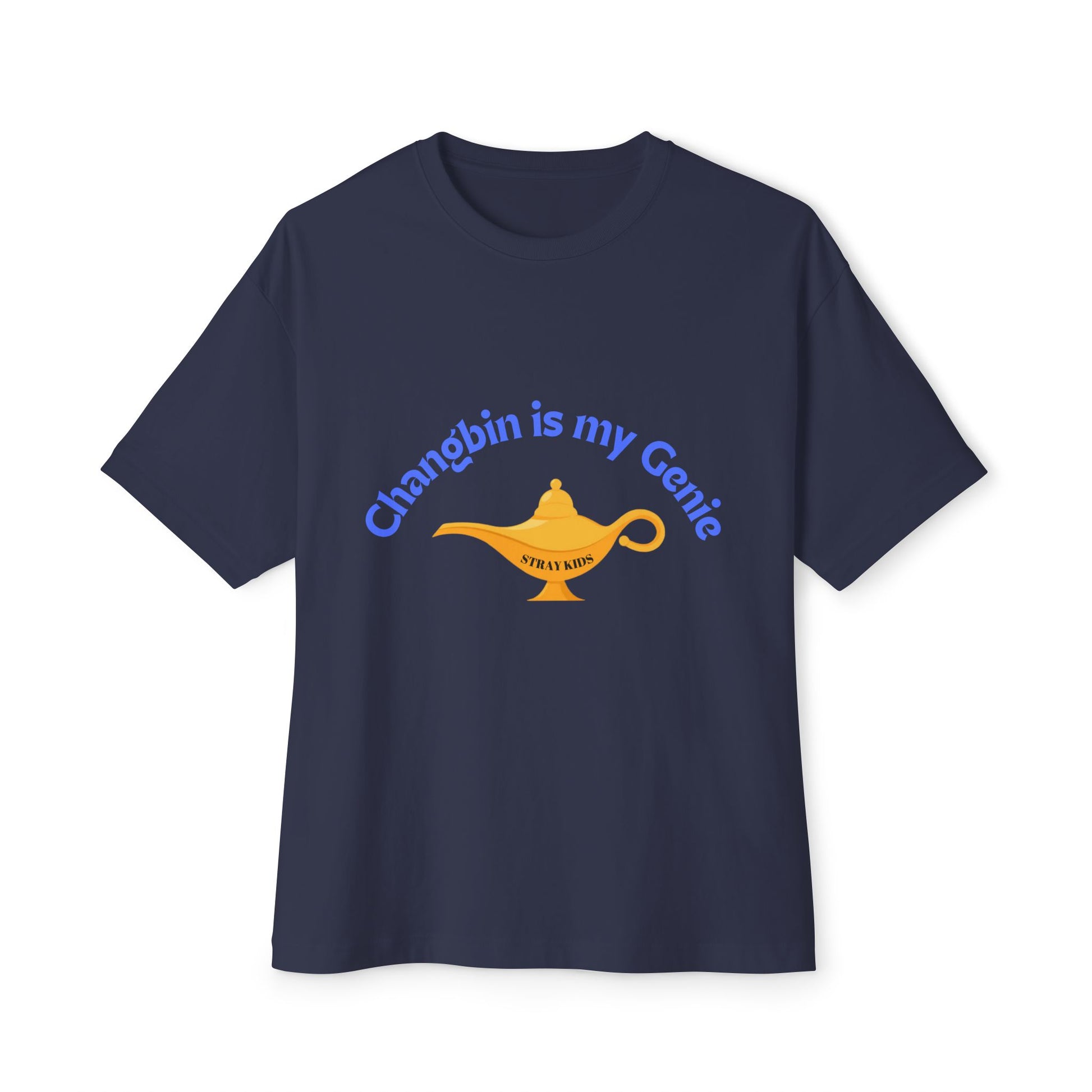 Soft, relaxed, and quietly playful — this oversized boxy tee wears like a cozy inside joke. A warm golden lamp sits beneath a curved, hand-lettered line: “Changbin is my Genie.” It settles across the chest with gentle color contrast that reads casual and affectionate. The roomy drop-shoulder silhouette and medium-weight cotton make it feel lived-in from the first wear. Slip it on when you want a low-key statement that speaks to fandom, late-night lyrics, and shared smiles. It pairs with joggers, denim, or a worn-in flannel for nights at a small show, coffee runs, or lounging while you replay favorite tracks.